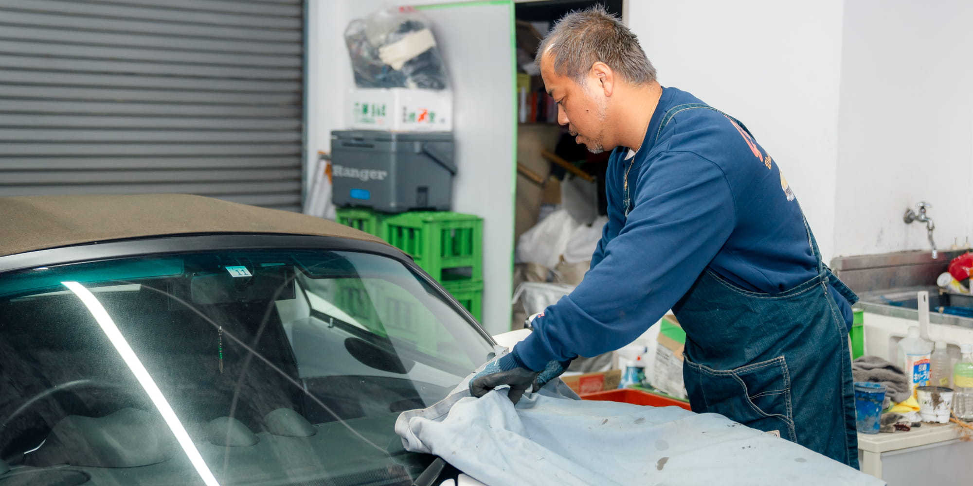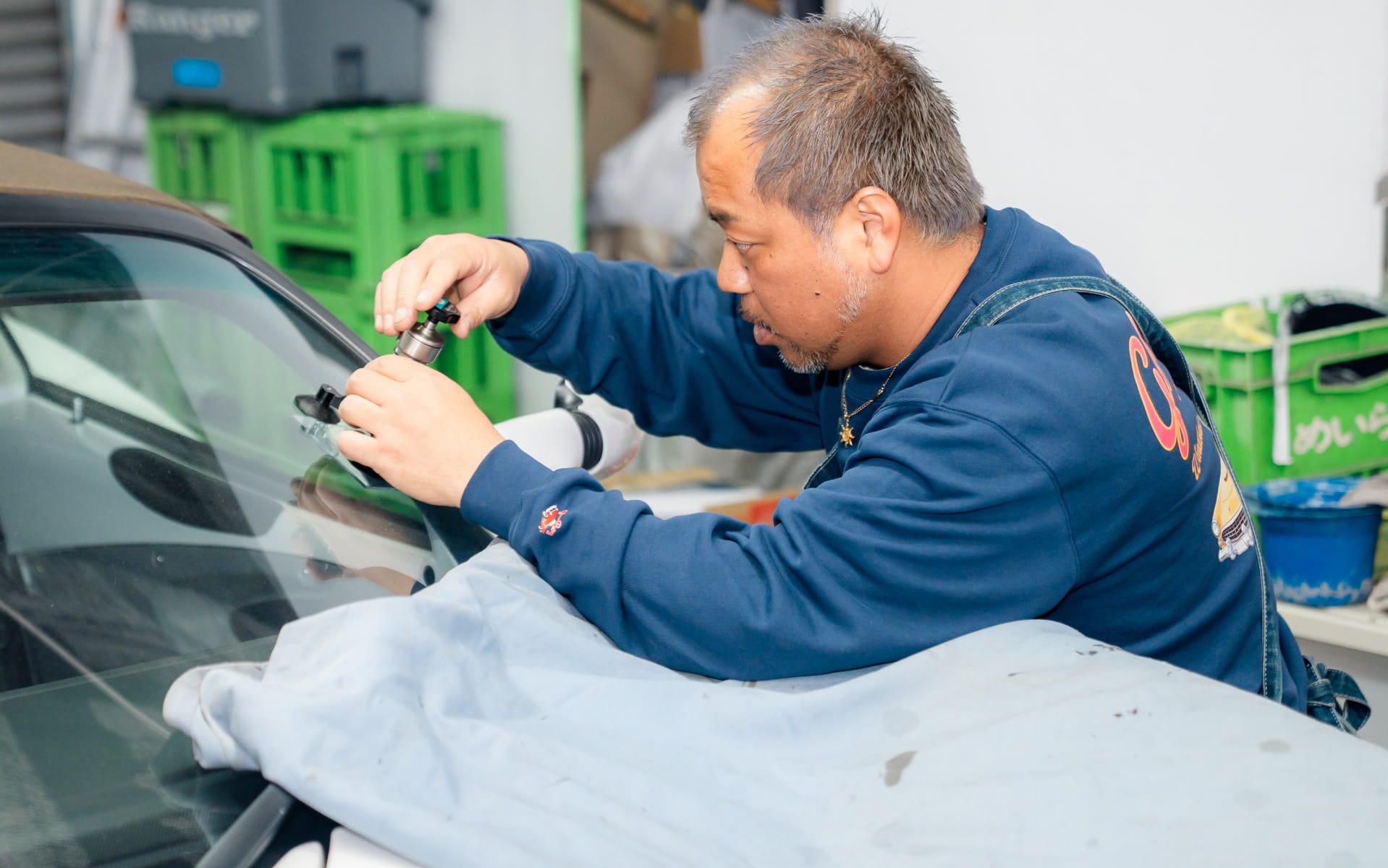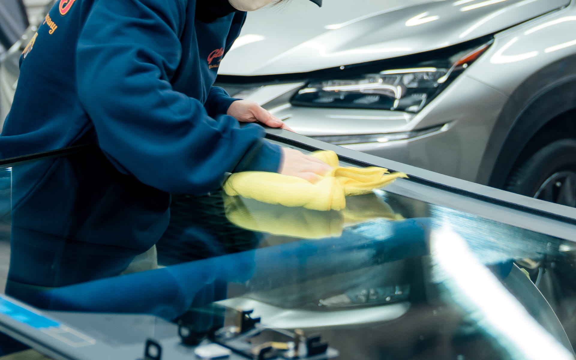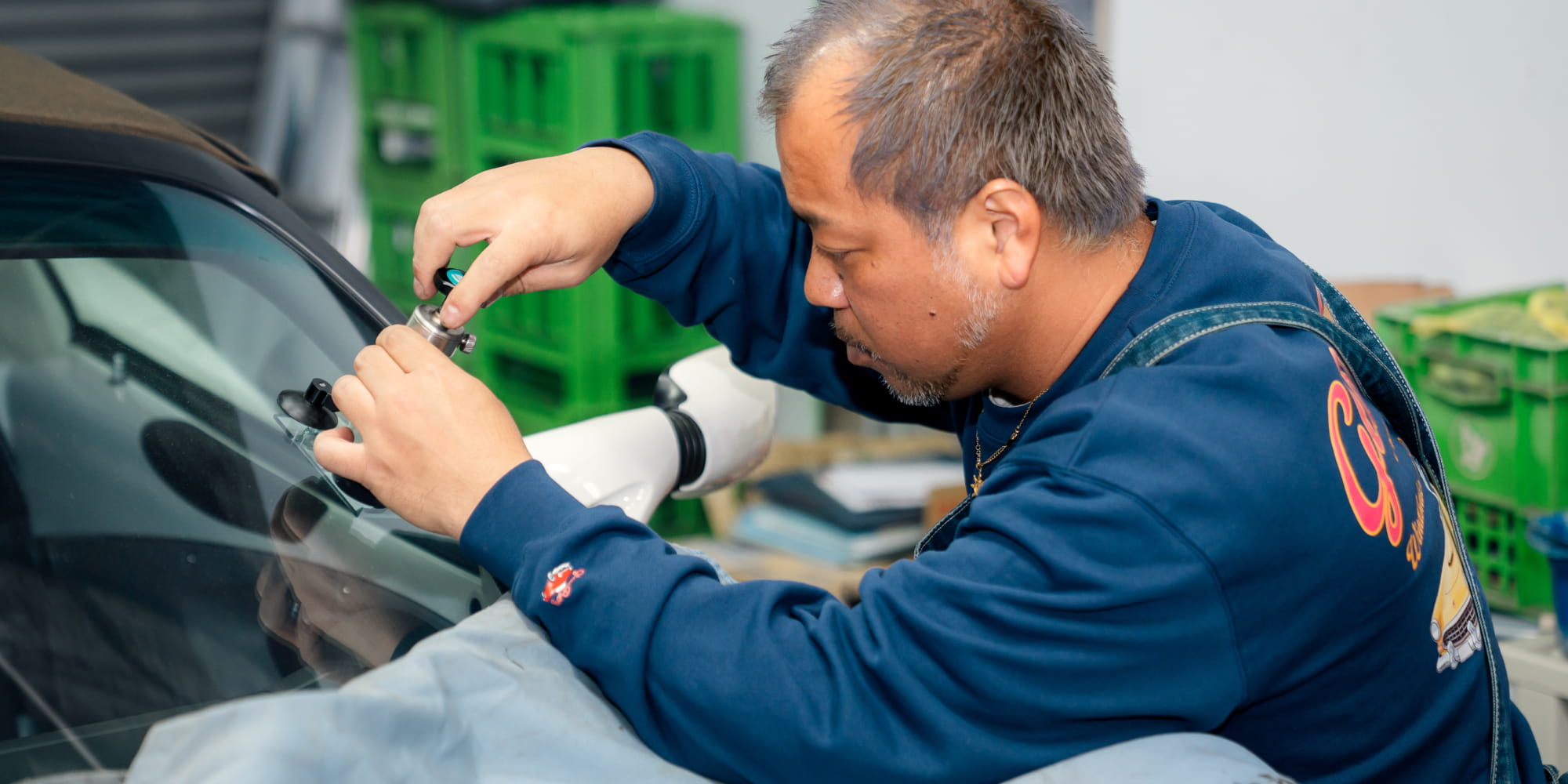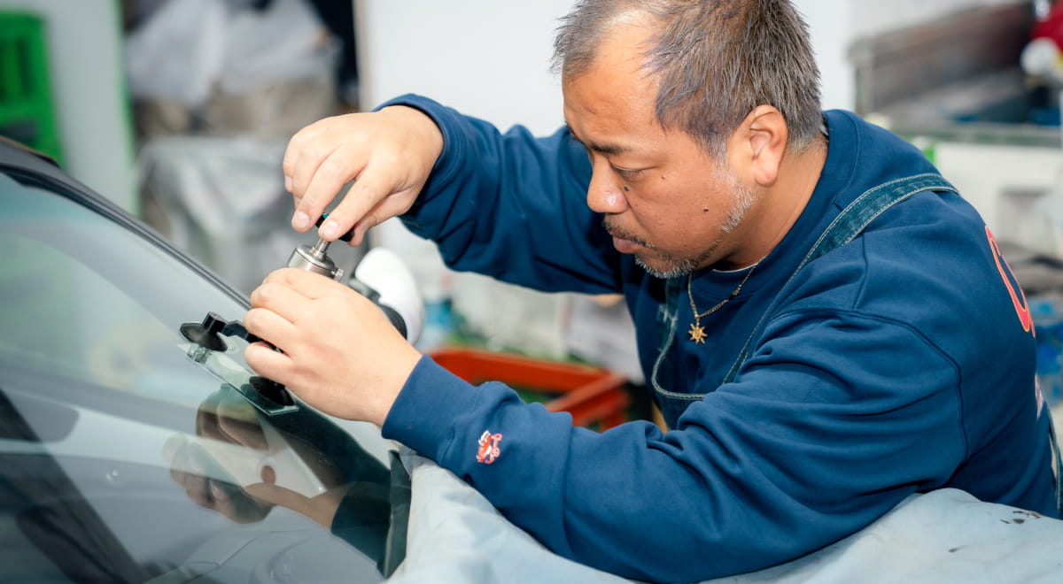 飛び石などで傷付いたガラスの修理には、ひび割れの中に入ってしまった空気を抜き、レジンを入れる作業を行います。